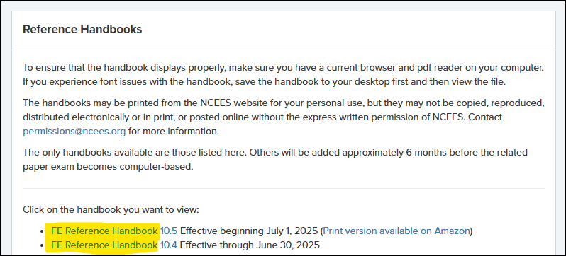 You can find the latest version of the reference handbook under the “common tasks” window when you log into your MyNCEES account. Refer to the images below.