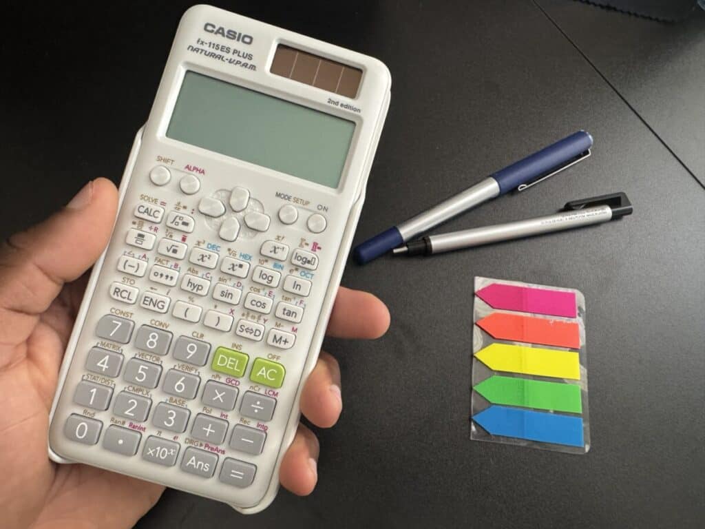I personally recommend the Casio FX–115ES PLUS, the one I am holding in the photo above. Its display functions are simple and pretty smooth. It also allows you to type in equations using fractions and exponents in a form that mimics the way it would look if you were to write it by hand – which makes it easier to verify that your input correctly matches the equations in the reference manual. It is a small detail, but I found it surprisingly beneficial throughout my studies and during the exam.